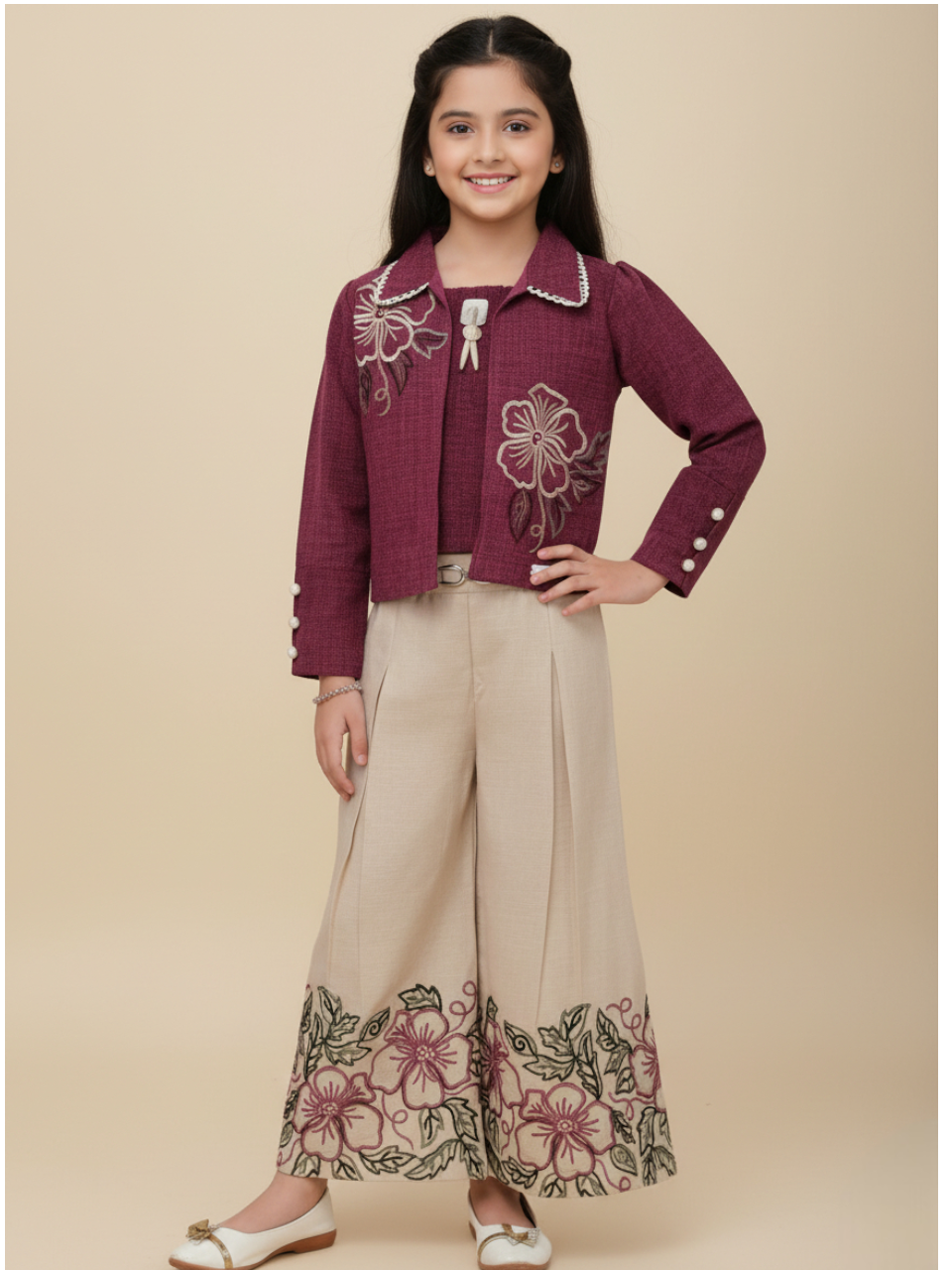 Graceful Brown Wine Jacket & Cream Palazzo Set – Girls 3 Pc Outfit
