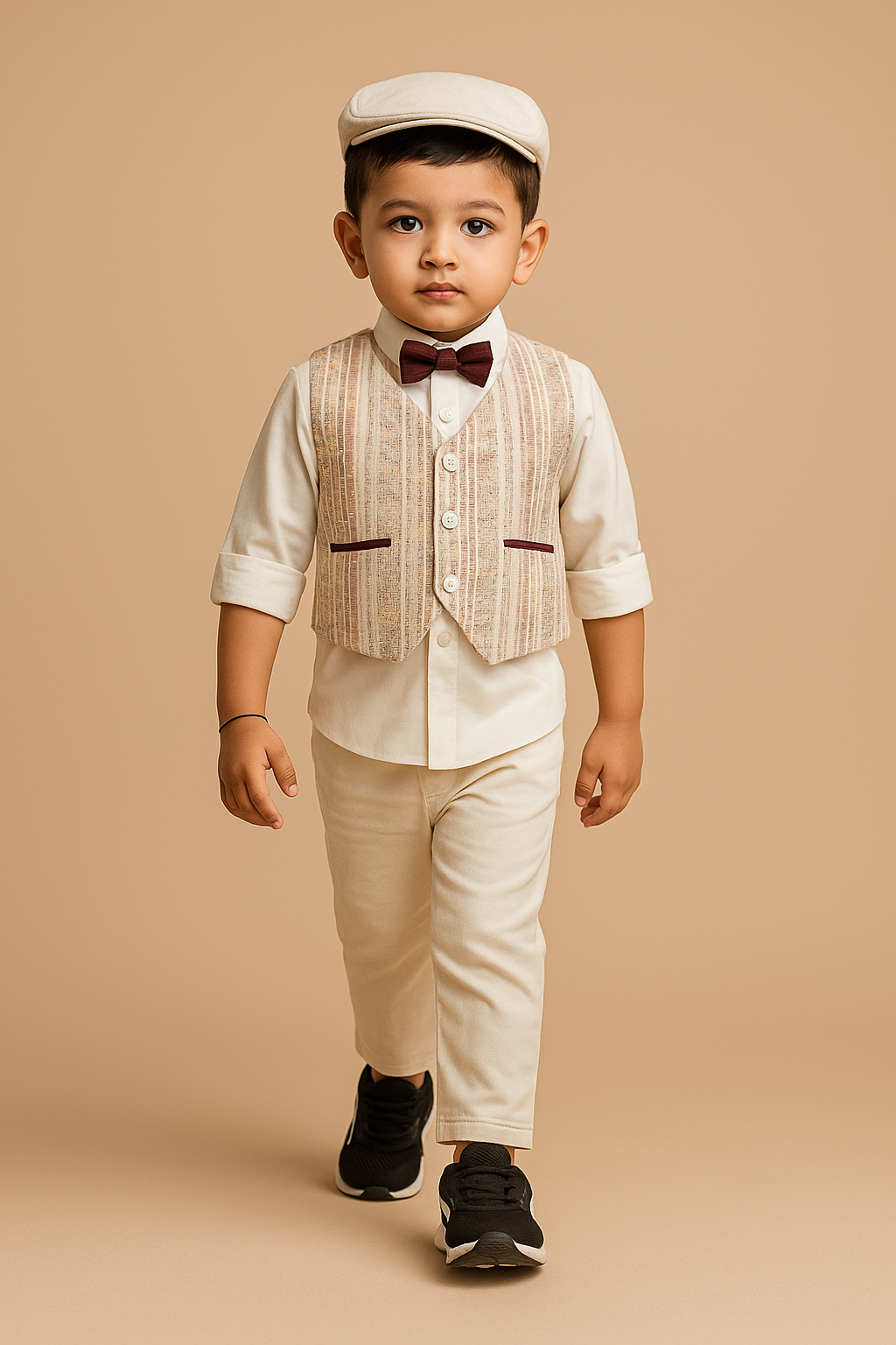 - Set: 3 Pc outfit – cream shirt, matching pants, and textured sleeveless jacket with bow tie. (Cap not included.)