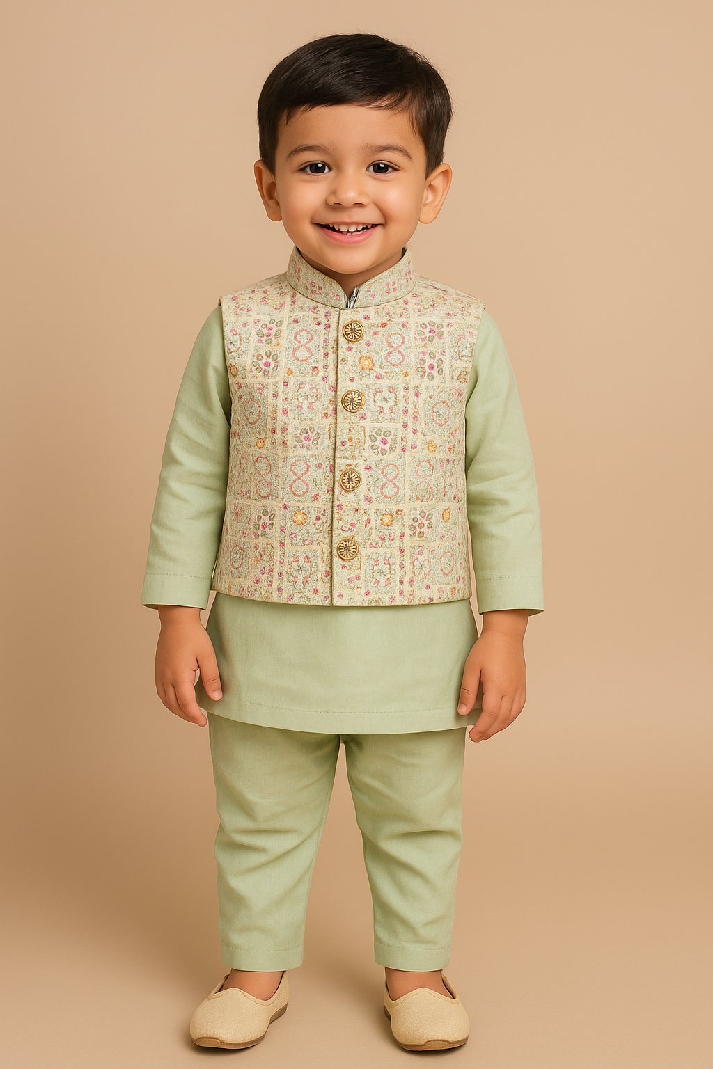 Refreshing Pista Green Jacket Kurta Set for Boy’s – 3 Pc Outfit