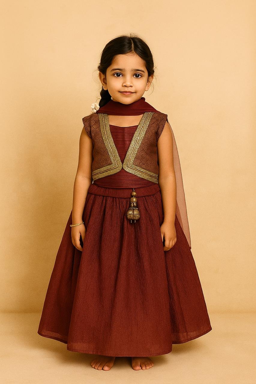 Add a royal and festive touch to your little one’s wardrobe with this Regal Wine Chaniya Choli. Crafted from soft crush fabric, this 2-piece outfit includes an intricately embroidered choli paired with a flared matching chaniya — ideal for weddings, Diwali, parties, and family celebrations.