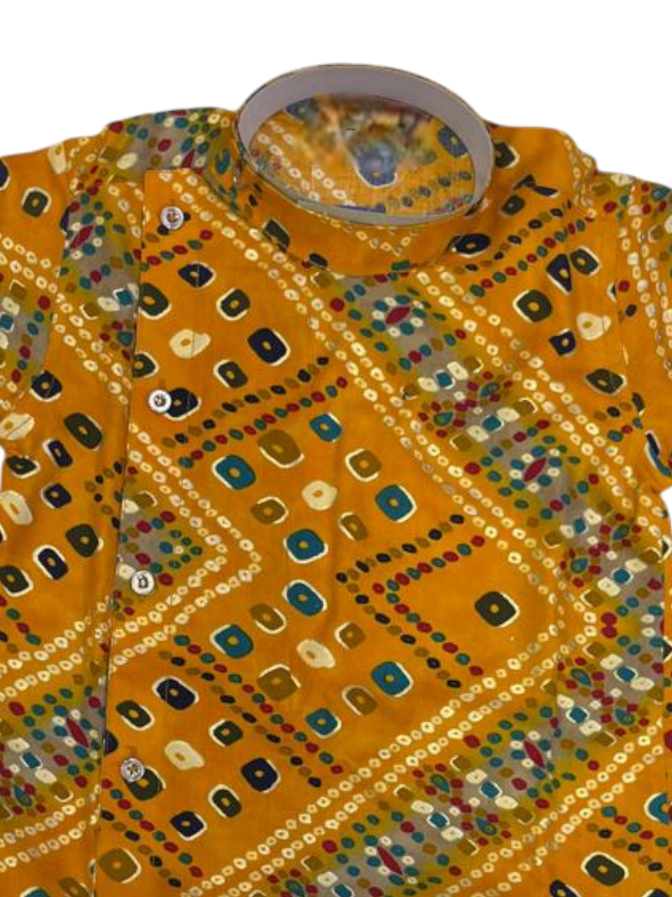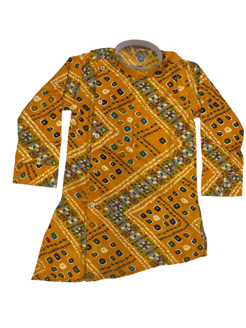 Brighten up your little one’s festive look with this Yellow Bandhani Kurta Set for Boy’s, a 2-piece outfit blending traditional charm with modern comfort. Perfect for Navratri, Garba nights, weddings, and cultural celebrations.